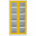 Skříně slouží k uložení chemických látek ve vlastním obalu. Uložené kapaliny stojí na roštu a tím nezmenšují záchytný objem polic. Skříň obsahuje 4 záchytné police s roštem o záchytném objemu 19 l na polici a spodní záchytnou vanu bez roštu o objemu 20 l. Dvoubodové uzamykání cylindrickým zámkem na klíč. Prosklené dveře uložené na vnitřních čepech lze otevřít do úhlu 110°. Povrchová úprava konstrukce práškovým lakem v barvě RAL. Kalené sklo tlošťky 4 cm.Skříně se skleněnými dveřmi na uskladnění chemikálií, 1950 x 1200 x 500 mm
