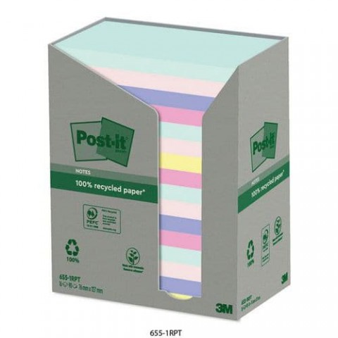 Samolepicí štítky Post-it®, 100 % ekologicky šetrné. Vyrobeny ze 100% recyklovaného papíru. Hodí se pro rychlé pořízení poznámky, odeslání zprávy nebo zanechání připomenutí. Po nalepení se dají snadno odlepit a přilepit na jiné místo. Dostupné v různých pastelových barvách. Ideální pro organizaci v kanceláři nebo při práci z domova.Bločky samolepicí Post-it