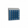 Svařované boxové skříně s malými schránkami s průzorem z plexiskla na osobní věci nebo ke skladování svačin a obědů. Jednotlivé schránky jsou samostatně uzamykatelné cylindrickým zámkem na klíč. Možnost umístění štítku se jménem nebo osobním číslem. Opatřeny horním šikmým nástavcem, otevírání dvířek až do úhlu 110°. Upevnění na zeď, vytvoření větších bloků spojením více skříní dohromady. Rozměry průzoru v x š - 117 x 95 mm.Svařované skříně na osobní věci Olaf s průhlednými dvířky, 25 boxů, cylindrický zámek