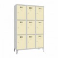 Šatní svařované skříně s boxy v několika barevných variantách, vhodné pro odkládání osobních věcí zaměstnanců na pracovištích, v převlékárnách nebo sportovních klubech. Odlehčená konstrukce z ocelového plechu tloušťky 0,5 mm s výztuhami zajišťuje dobrou stabilitu. Účinné odvádění vlhkosti z oděvů větracími otvory na dveřích. Dvířka boxů jsou zavěšená na vnitřních pantech. Uzamykání každého boxu cylindrickým zámkem, který je možné vyměnit za otočný uzávěr. Možnost umístění štítku se jménem v horní části dveří.Svařované šatní skříně Jensen, 9 boxů, cylindrický zámek