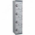 Svařovaná šatní skříň z odolného profilovaného ocelového plechu o tloušťce 0,6 mm (odpovídá 0,8 mm standardnímu). Odolná dvířka se otevírají až do úhlu 120°. Perforace ve dveřích i konstrukci skříně pro lepší odvod vlhkosti. Možnost umístění štítku se jménem. Uzamykání na kód.Svařované šatní skříně Acial, 1 sloupec, 4 boxy, 400 mm, kódový zámek