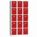 Svařované boxové šatní skříňky v několika barevných variantách, vhodné pro odkládání věcí na pracovištích, převlékárnách nebo sportovních klubech. Konstrukce z ocelového plechu tloušťky 0,6 mm s výztuhami zajišťuje dobrou stabilitu. Účinné odvádění vlhkosti z oděvů větracími otvory na zadní straně. Dvířka boxů jsou zavěšená na vnitřních pantech. Tlumení hluku při zavírání dvířek zajišťují plastové dorazy. Uzamykání každého boxu cylindrickým zámkem. Snadno udržovatelný hladký prostor uvnitř boxu. Možnost umístění štítku se jménem v horní části dveří. Skříň na vyvýšeném rámu, který je osazen čtyřmi plastovými patkami. Světlost dvířek 31 x 20,9 cm.Svařované šatní skříně Philip, 15 boxů, cylindrický zámek