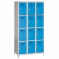 Svařované boxové skříně s odlehčenou konstrukcí a výztuhami zajišťujícími dobrou stabilitu. Vhodné pro odkládání osobních věcí na pracovištích, kulturních akcích, v převlékárnách apod. Vyrobeno z ocelového plechu tloušťky 0,5 mm. Perforovaná dvířka zavěšená na vnitřních pantech zajišťují účinné odvětrávání vnitřního prostoru. Jednotlivé boxy jsou samostatně uzamykatelné cylindrickým zámkem s možností výměny za otočný uzávěr (nutno dokoupit zvlášť). Možnost umístění štítku se jménem.Svařované šatní skříně Eric odlehčené, 12 boxů, cylindrický zámek