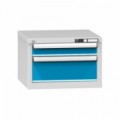 Nízké dílenské skříně na odnímatelných nožkách z polypropylenu, které umožňují umístění na morký podklad. Skříňky jsou opatřené horní 3cm bezpečnostní hranou a obsahují dvě zásuvky a dvě vyjímatelné a výškově nastavitelné police.Dílenské skříně na nářadí Manutan Expert, 102 x 100 x 50 cm