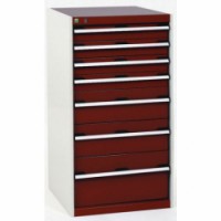 Zásuvkové skříně Bott Cubio se zásuvkami s nosností 75 kg a 100% výsuvy na válečkových ložiskách. Robustní svařovaná ocelová konstrukce s nosností až 1,5 tuny, povrchová úprava práškovým lakem. Systém centrálního zámku i blokace otevření více zásuvek najednou. Ergonomické rukojeti s popisovatelnou lištou, uzamykání cylindrickým zámkem se dvěma klíči.Dílenské zásuvkové skříně Bott Cubio, 120 x 65 x 52,5-75 cm, 7 zásuvek