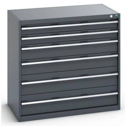 Zásuvkové skříně Bott Cubio se zásuvkami s nosností 200 kg a 100% výsuvy na válečkových ložiskách. Robustní svařovaná ocelová konstrukce s nosností až 1,5 tuny, povrchová úprava práškovým lakem. Systém centrálního zámku i blokace otevření více zásuvek najednou. Ergonomické rukojeti s popisovatelnou lištou, uzamykání cylindrickým zámkem se dvěma klíči.Dílenské zásuvkové skříně Bott Cubio 200, 100 x 105 x 65-75 cm, 6 zásuvek