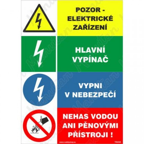 Kombinace čtyř tabulek k elektrickému zařízení s texty: pozor elektrické zařízení, hlavní vypínač, vypni v nebezpečí a nehas vodou ani pěnovými přístroji. Upevnění na stěnu mechanicky nebo samolepicí fólií. Značky jsou bezúdržbové s dlouhou životností. Texty v jiném než českém jazyce dostupné na vyžádání (minimální objednávka 10 ks). materiál: plast, samolepicí fólie rozměry v x š: 200 x 150 mm popis: Kombinace čtyř tabulek k elektrickému zařízení způsob uchycení: mechanické (plast); samolepicí (samolepicí fólie) umístění: na stěnu balení: 1 ks spojovací materiál není součástí baleníInformační bezpečnostní tabulky - Kombinace čtyř výstražných tabulek k elektrickému zařízeni