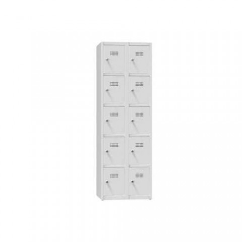 Plechové šatní skříně pro uložení drobných osobních věcí. Dveře jednotlivých boxů jsou uloženy na vnitřních pantech s úhlem otevření více než 90°. Šatníky jsou standardně vybaveny cylindrickým zámkem pro každou buňku (možnost zámku s cylindrickou vložkou nebo uzávěru pro visací zámky). Součástí jsou plastové háčky pro zavěšení uschovaných věcí. Větrací otvory ve dvířkách. K dostání ve třech barevných variantách.Kovové šatní skříně, 10 boxů, 1850 x 600 x 500 mm, šedá
