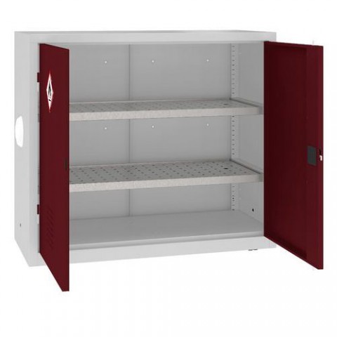 Nízké kovové skříně pro skladování chemikálií. Vybavené retenčními policemi s roštem s pozinkovaným povrchem, nastavitelné v rastru 25 mm. Monolitická svařovaná konstrukce z oceli tl. 1 mm zajišťuje vysokou pevnost. Křídlové dveře mají větrací otvory pro cirkulaci vzduchu a jsou opatřené štítkem GHS-02 pro standardní identifikaci chemického nebezpečí. Tříbodový zámek RONIS (dodáváno se 2 klíči). Vyrovnávací nožky, které jsou nastavitelné zevnitř. Posuvníky pro snadný pohyb skříně a ochranu podlahy. Pro vysokou bezpečnost lze přikotvit ke zdi. Před lakováním jsou skříně potaženy zirkoniovou vrstvou, která je chrání před korozí a zvyšuje přilnavost laku. Skříně jsou opatřené nátěrem, který má klasifikaci reakce na oheň: A2-s1, d0 dle norem PN-EN 13501-1:2019-02. Vyráběno v souladu s normami ISO:9001 a ISO:14001.Kovové skříně na chemikálie, 104 x 120 x 50 cm