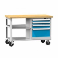 Mobilní dílenské stoly PPS jsou standardně osázeny koly s polypropylenovým běhounem a průměrem 125 mm. Kola se na výrobek montují vždy po jednom páru pevných kol a jednom páru otočných kol s brzdou. Kvalitní tvarově stálá deska vrstvená a lepená z pařené bukové dýhy o šířce 120 cm a síle 40 mm. Součástí stolu je zásuvková skříň se čtyřmi zásuvkami. Zásuvky stolů jsou uzamykatelné a vybavené blokační pojistkou proti samovolnému otevření při pohybu stolu. Pro mobilní pracovní stoly PPS lze použít pouze perforovaný panel modulu 1 000 mm a sloupek se zkráceným uchycením. Nosnost stolu je 380 kg.Mobilní dílenské stoly PPS Multiplex, 81 x 120 x 70 cm, 4 zásuvky a 2 police, buk