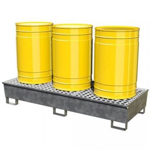 Záchytná nádrž pro vertikální skladování sudů s toxickými, znečišťujícími a hořlavými produkty. Zařízení z ocelového plechu, trubek a úhelníků. Ekonomický výrobek. Vodotěsné svařování a těsnění, továrně kontrolované.Ocelové záchytné vany s roštem - Manutan Expert, pro 3 sudy