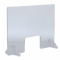 Rozměry přepážky 100 × 65 cm. Průhledný termoplastický polymer, řezaný a leštěný. Stabilní konstrukce se dvěma širokými, nasazovacími nohami. Kontaktní otvor 15 x 25 cm vytváří snadný předávací prostor. Použití v kancelářích, na přepážkách a ve veřejných prostorách.Ochranná přepážka z plexiskla, otvor 15 x 25 cm