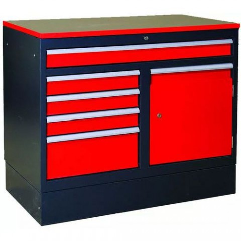 Kovový svařovaný stůl vhodný do dílny je vyrobený z kvalitního ocelového plechu tl. 0,7 - 2 mm. Stolová DTD deska s ABS hranami 21 mm. Stůl je vybavený 5 zásuvkami v různých velikostech se 100% výsunem na kuličkových lištách. Nosnost jedné zásuvky je 40 kg. Skříňka s pozinkovanou policí nabízí další úložný prostor. Plastové rukojeti. Uzamykání cylindrickým zámkem. Povrchová úprava polyesterovým vypalovaným práškovým lakem v barvách RAL 7016, 3000 a 7001.Pracovní stůl Denner na soklu, 93 x 110 x 60 cm