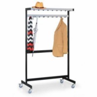 Řadový stojanový věšák s odkládací policí v jednostranném provedení s kolečky. Vhodný do kanceláří, přístupových hal a předsíní. Konstrukce věšáku je vyrobena z hranatých ocelových trubek o rozměrech 50 x 20 mm. Horní rošt je tvořen z trubek o průměru 22 mm. Povrchová úprava práškovým lakem.Řadový stojanový věšák Aiden s odkládací policí
