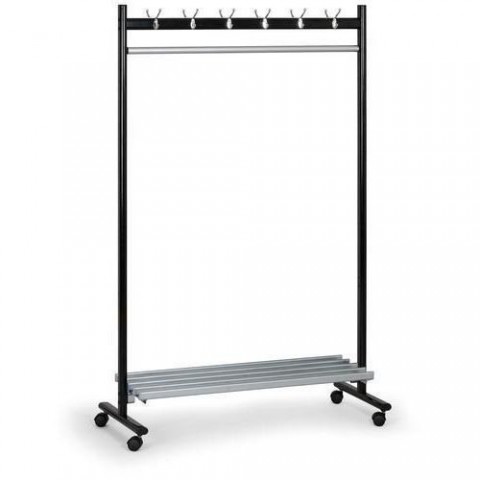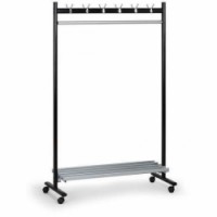 Kovový stojanový věšák v oboustranném provedení s kolečky. Součástí je závěsná tyč na ramínka a odkládací rošt na boty nebo doplňky. Věšák je vyroben z oválné trubky o rozměrech 50 x 30 mm. Rošt o rozměrech 1040 x 325 mm. Povrchová úprava práškovým lakem.Řadový stojanový věšák Jerry II s policí