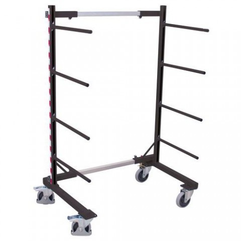 Teleskopické vozíky s osmi nosnými rameny o délce 595 mm. Možnost nastavení výšky nosných ramen, maximální nosnost na jednu úroveň je 40 kg. Plynule nastavitelná šířka vozíku 540 - 1 400 mm nebo 540 - 1 700 mm. Pojízdnost zajišťují 2 otočná kola a 2 otočná kola s brzdou. Šedé pneumatiky z termoplastické pryže nezanechávající stopy na plastovém ráfku s přesnými kuličkovými ložisky, kryty proti namotávání nití.Regálové vozíky s nosnými rameny, jednostranné, 8 ramen