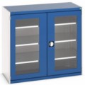 Kovové dílenské skříně s průhlednými plexi dveřmi pro snadnou kontrolu obsahu. Pozinkované police s nosností 100 kg, výškově nastavitelné v rastru 25 mm. Svařovaná ocelová konstrukce, povrchová úprava práškovým lakem. Uzamykání tříbodovým cylindrickým rozvorovým zámkem se dvěma klíči.Dílenské skříně s průhlednými dveřmi Bott Cubio, výška 200 cm