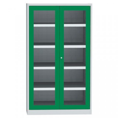 Skříně slouží k uložení chemických látek ve vlastním obalu. Uložené kapaliny stojí na roštu a tím nezmenšují záchytný objem polic. Skříň obsahuje 4 záchytné police s roštem o záchytném objemu 19 l na polici a spodní záchytnou vanu bez roštu o objemu 20 l. Dvoubodové uzamykání cylindrickým zámkem na klíč. Prosklené dveře uložené na vnitřních čepech lze otevřít do úhlu 110°. Povrchová úprava konstrukce práškovým lakem v barvě RAL. Kalené sklo tlošťky 4 cm.Skříně se skleněnými dveřmi na uskladnění chemikálií, 1950 x 1200 x 500 mm