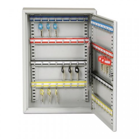 Ocelová uzamykatelná schránka určená k uložení klíčů s číslovaným seznamem na vnitřní straně dvířek. Příslušenství obsahuje samolepící čísla, identifikační schéma a upevňovací materiál.Skříňka na klíče, 64 háčků