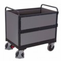 Ocelové vozíky jsou vybavené třemi pevnými a jednou sklopnou stěnou. Ložná plocha je vyrobená z MDF desky. Jednoduchá manipulace pomocí kovového madla. Pohyb zajišťují čtyři kola s valivými kuličkovými ložisky, z nichž dvě jsou pevná a dvě otočná s brzdou Easy Stop a ochrannými kryty.Skříňové vozíky s madlem a plnými stěnami, do 500 kg, 1 sklopná stěna