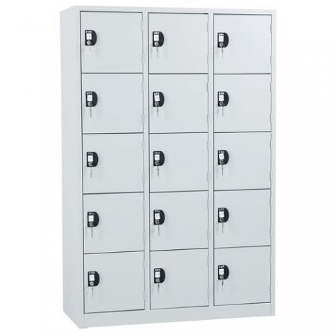 Svařované šatní skříně s boxy vhodné pro odkládání osobních věcí zaměstnanců na pracovištích, v převlékárnách nebo sportovních klubech. Konstrukce z ocelového plechu tloušťky 0,7 mm s výztuhami zajišťuje dobrou stabilitu. Účinné odvádění vlhkosti z oděvů větracími otvory zadní straně boxů. Dvířka boxů jsou zavěšená na vnějších pantech a jsou opatřeny plastovými nárazníky pro snížení hluku při zavírání. Možnost umístění štítku se jménem v plastovém úchytu na dveřích.Svařované šatní skříně Manutan Expert Mike, 15 boxů, cylindrický zámek