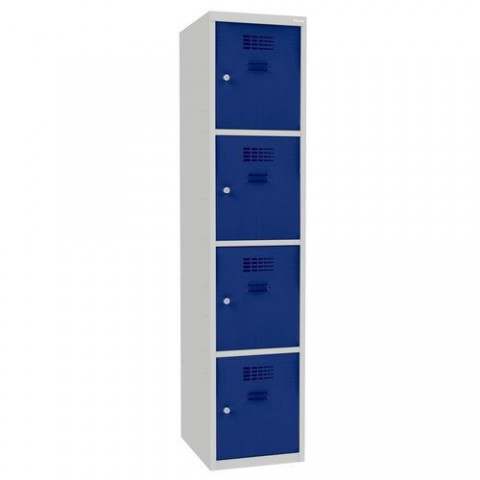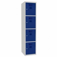 Svařované šatní skříně s boxy v několika barevných variantách, vhodné pro odkládání osobních věcí zaměstnanců na pracovištích, v převlékárnách nebo sportovních klubech. Odlehčená konstrukce z ocelového plechu tloušťky 0,5 mm s výztuhami zajišťuje dobrou stabilitu. Účinné odvádění vlhkosti z oděvů větracími otvory na dveřích. Dvířka boxů jsou zavěšená na vnitřních pantech. Uzamykání každého boxu cylindrickým zámkem, který je možné vyměnit za otočný uzávěr. Možnost umístění štítku se jménem v horní části dveří.Svařované šatní skříně Oskar, 4 boxy, cylindrický zámek