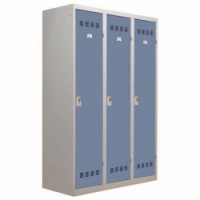 Šatní skříň svařovaná z ocelového plechu tloušťky 0,7 mm. Každý oddíl je vertikálně rozdělen mezistěnou umožňující odložení čistých a špinavých oděvů. Každý oddíl je vybaven tyčí na ramínka a dvěma háčky. Uzamykání otočným uzávěrem na visací zámek (není součástí dodávky). Perforovaná dvířka zajišťují účinné odvětrávání vnitřního prostoru. Možnost umístění štítku se jménem.Svařované šatní skříně Vinco s mezistěnou, 3 oddíly, 400 mm, otočný uzávěr
