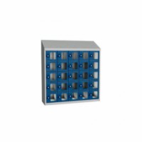 Svařované boxové skříně s malými schránkami s průzorem z plexiskla na osobní věci nebo ke skladování svačin a obědů. Jednotlivé schránky jsou samostatně uzamykatelné cylindrickým zámkem na klíč. Možnost umístění štítku se jménem nebo osobním číslem. Opatřeny horním šikmým nástavcem, otevírání dvířek až do úhlu 110°. Upevnění na zeď, vytvoření větších bloků spojením více skříní dohromady. Rozměry průzoru v x š - 117 x 95 mm.Svařované skříně na osobní věci Olaf s průhlednými dvířky, 25 boxů, cylindrický zámek