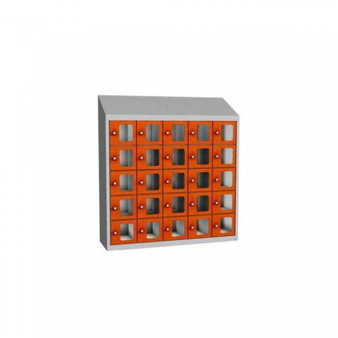 Svařované boxové skříně s malými schránkami s průzorem z plexiskla na osobní věci nebo ke skladování svačin a obědů. Jednotlivé schránky jsou samostatně uzamykatelné visacím zámkem. Možnost umístění štítku se jménem nebo osobním číslem. Opatřeny horním šikmým nástavcem, otevírání dvířek až do úhlu 110°. Upevnění na zeď, vytvoření větších bloků spojením více skříní dohromady. Rozměry průzoru v x š - 117 x 95 mm.Svařované skříně na osobní věci Olaf s průhlednými dvířky, 25 boxů, otočný uzávěr