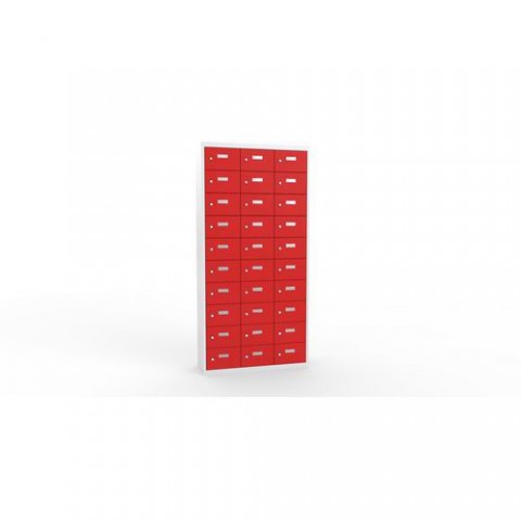 Skříně ze svařovaného plechu s malými schránkami na uložení osobních věcí. Vhodné do kantýny, posiloven, fitness center, bazenů nebo recepce hotelů. Jednotlivé schránky jsou samostatně uzamykatelné cylindrickým zámkem na klíč. Možnost vložení štítku se jménem nebo číslem na dvířka každé schránky.Svařované skříně na osobní věci Ron I, 30 boxů, cylindrický zámek