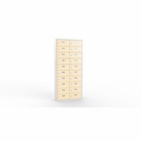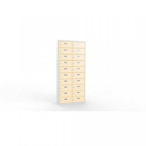 Skříně ze svařovaného plechu s malými schránkami na uložení osobních věcí. Vhodné do kantýny, posiloven, fitness center, bazenů nebo recepce hotelů. Jednotlivé schránky jsou samostatně uzamykatelné cylindrickým zámkem na klíč. Možnost vložení štítku se jménem nebo číslem na dvířka každé schránky.Svařované skříně na osobní věci Ron II, 20 boxů, cylindrický zámek
