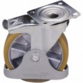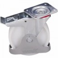 Bílé pojezdové kolo z polyamidu s přesnými kuličkovými ložisky. Otočné s brzdou a vybavené ochranou noh. Teplotní odolnost od -20 do +80 °C. Tvrdost 75° Shore D.Polyamidová pojezdová kola s přírubou, průměr 125 - 200 mm, kuličkové ložisko, otočná s brzdou