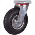 Otočná pneumatická kola na ocelovém ráfku s válečkovým ložiskem. Drážkovaný profil pneumatiky. Nízká hlučnosti, dobrý jízdní komfort.Nafukovací pojezdová kola s přírubou, průměr 150 - 230 mm, válečkové ložisko, otočná