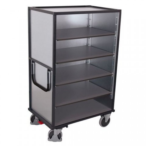 Vysoké policové vozíky s pěti policemi a třemi stěnami jsou vhodné pro bezpečnou přepravu a uskladnění zboží. Police jsou vyrobené z MDF desky, čtyři z nich jsou přestavitelné v rastru 10 cm. Jednoduchá manipulace pomocí kovového madla. Pohyb zajišťují čtyři kola s valivými kuličkovými ložisky, z nichž dvě jsou pevná a dvě otočná s brzdou Easy Stop a ochrannými kryty.Vysoké skříňové vozíky s madlem a 3 plnými stěnami, do 500 kg, 5 polic