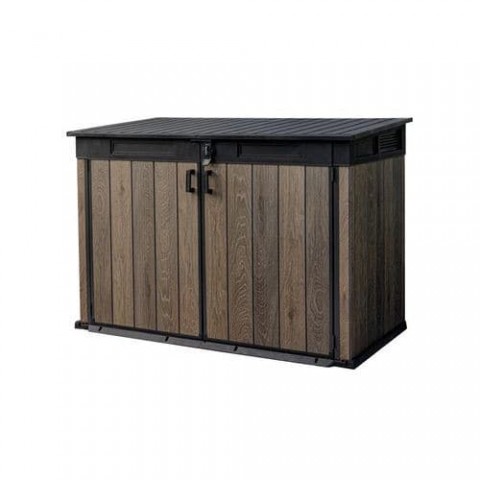 Zahradní plastová skříň v odstínu vlašského ořechu. Díky objemu 2 020 l v ní lze uschovat až dvě popelnice o objemu 360 l nebo tři popelnice o objemu 240 l. Materiál nekoroduje, neloupe se a není potřeba ho nijak udržovat, takže si zachová svůj vzhled i kvalitu po mnoho sezón. Díky materiálu Decocoat (lisovaný plast) má skříň velmi pevné plastové stěny v dokonalé imitaci dřeva. Nabízí elegantní a praktické řešení pro uložení popelnic, ale i dalšího zahradního náčiní. Hydraulické písty a kovové nerezové panty s otevíráním až do 180° usnadňují přístup. Zkosený práh umožňuje snadnou manipulaci s těžšími nádobami. Nastavitelné držáky na police umožňují variabilní využití prostoru. Skříň je uzamykatelná, což zajišťuje ochranu Vašich věcí před nechtěnými návštěvníky. Vestavěný ventilační systém zabraňuje hromadění nepříjemných pachů. Je součástí řady Signature, což vám umožní sjednotit exteriér s dalšími prvky, jako je zahradní domek nebo skříň na popelnice.Zahradní skříň Signature, tmavě hnědá, 2 020 l
