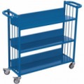 Ocelový vozík na knihy se třemi policemi. Police jsou nakloněné v úhlu 5° proti vypadnutí knih. Vzdálenost mezi policemi 300 mm, na otevřené straně 275 mm. Madla na obou čelech vozíku. 4 otočná kola, z toho 2 s brzdou. Šedá kola z termoplastické nešpinivé pryže na plastovém ráfku s přesnými kuličkovými ložisky.Vozíky na knihy, 3 police